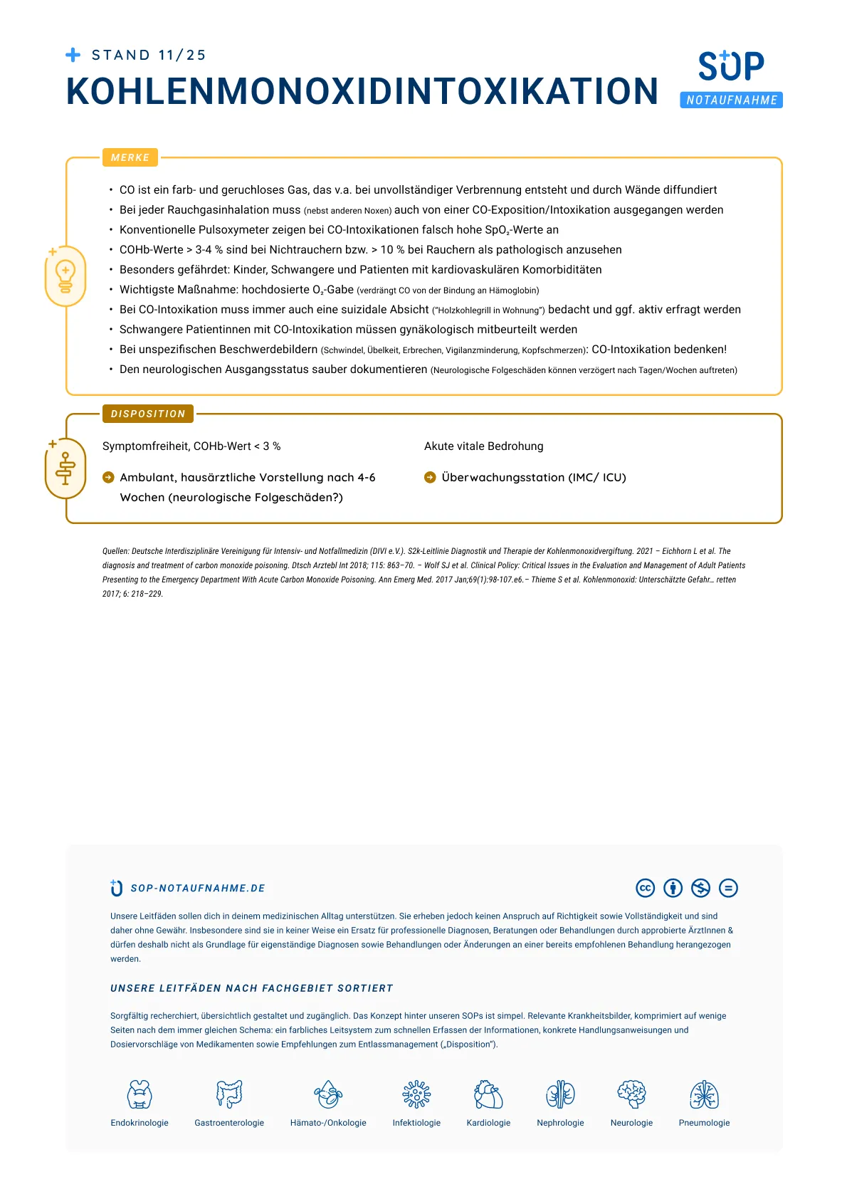 Kohlenmonoxidintoxikation: Vergiftung durch Einatmen von Kohlenmonoxid (CO) mit entsprechenden Symptomen. Diese sind abhängig von der CO-Konzentration in der Atemluft, Expositionsdauer, Atemminutenvolumen und individuellen Faktoren.